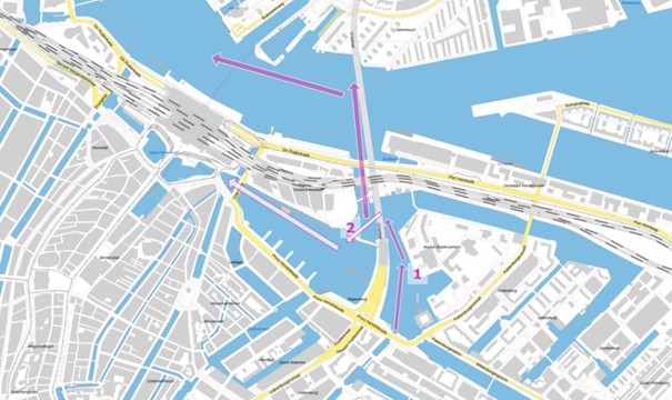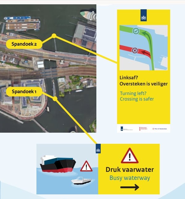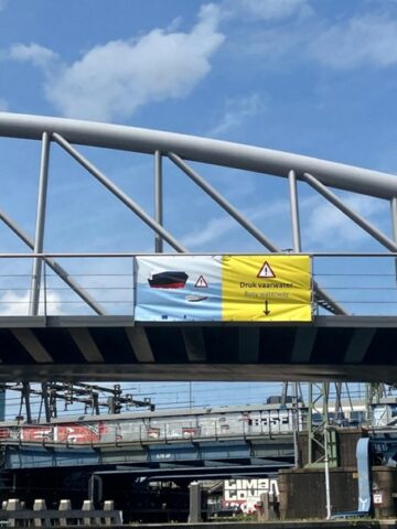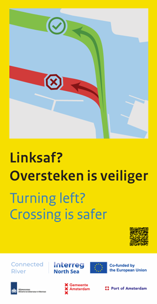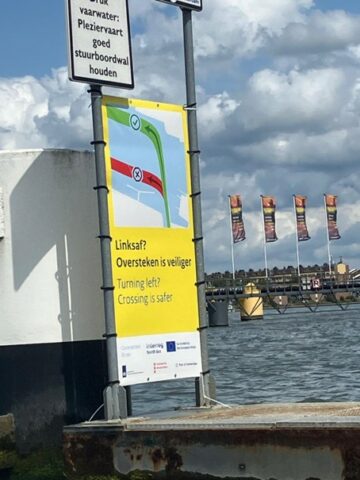 The Connected River project is a EU-funded project that aims to boost the capacities of multi-stakeholder ecosystems to deliver services that guarantee the safety, accessibility, and livability of waterways & waterfronts in the North Sea Region. One of the experimentations of the project takes place on the river IJ. The main problem is that recreational skippers travelling on the IJ, often do not take the official route, creating a hazardous environment. To address this issue, Rijkswaterstaat installed seasonal banners with clear visuals to attract attention and change this behaviour. The banners are a low-cost way to nudge hard-to-reach recreational skippers to take the right route. By placing them just before a decision point on the water, they have the most impact.