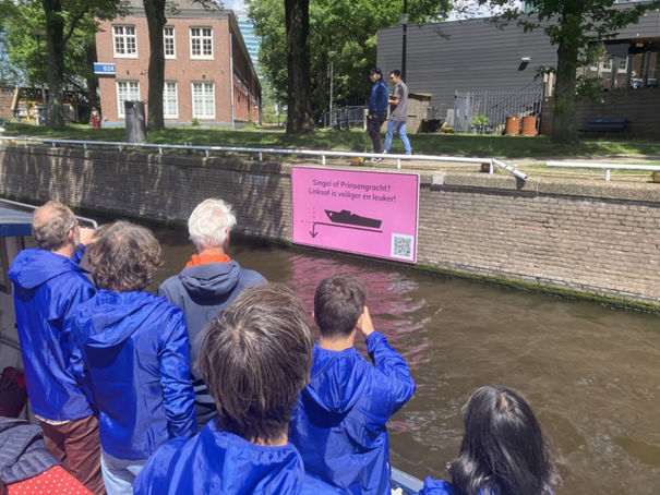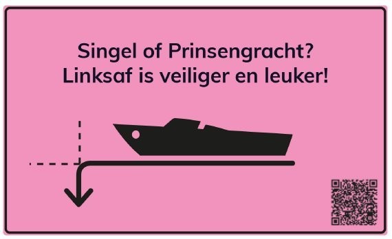 So, the next step was to create nudging signs: colourful, pink signs with positive messages, inspired by signs the municipality used to encourage cyclists to take a detour. However, installing signs in a busy area with many different public authorities proved challenging. It was difficult to get permission to hang them. After another round of feedback, it became clear that, since Amsterdam is such an international city, people preferred signs in both Dutch and English.